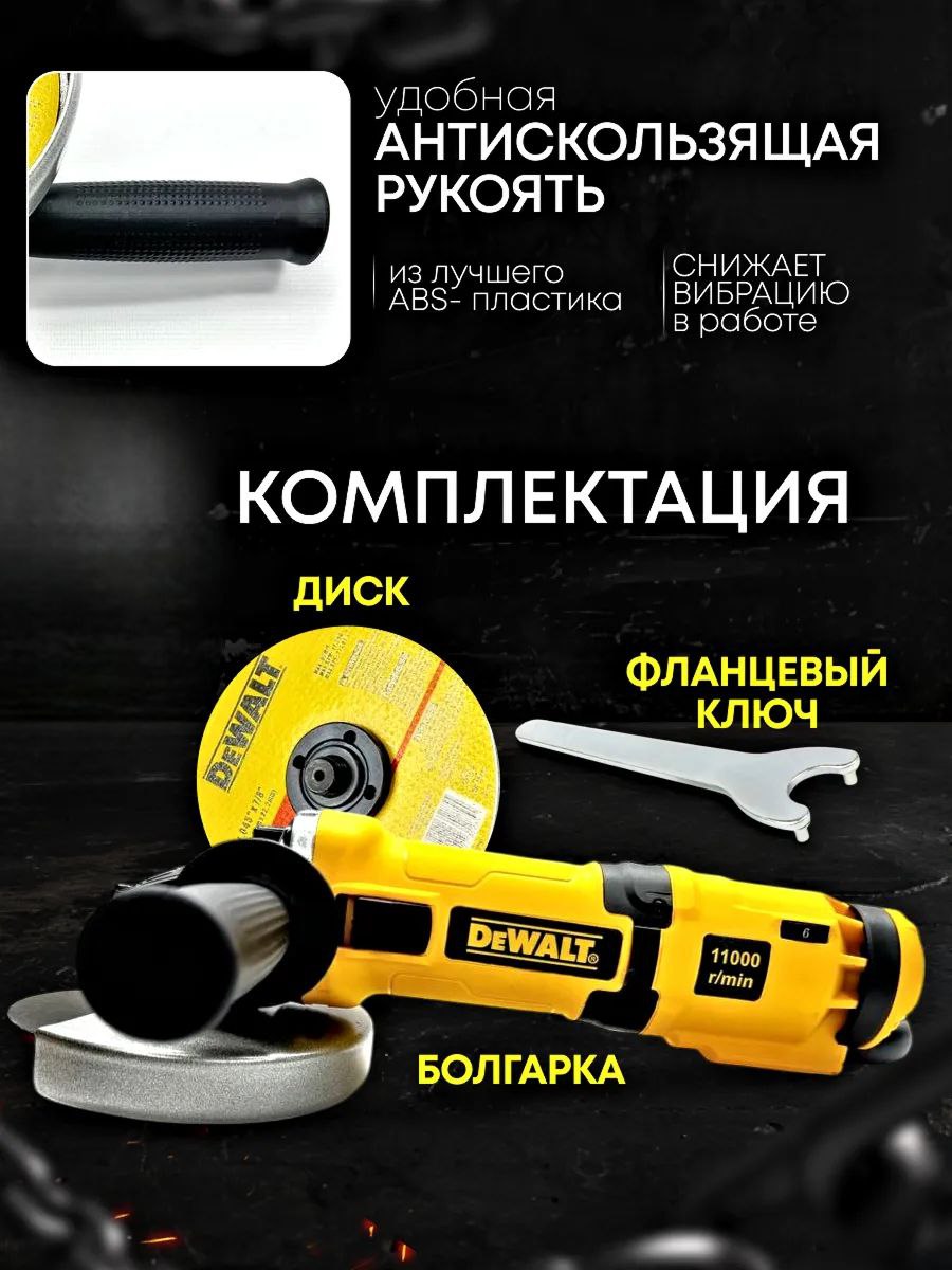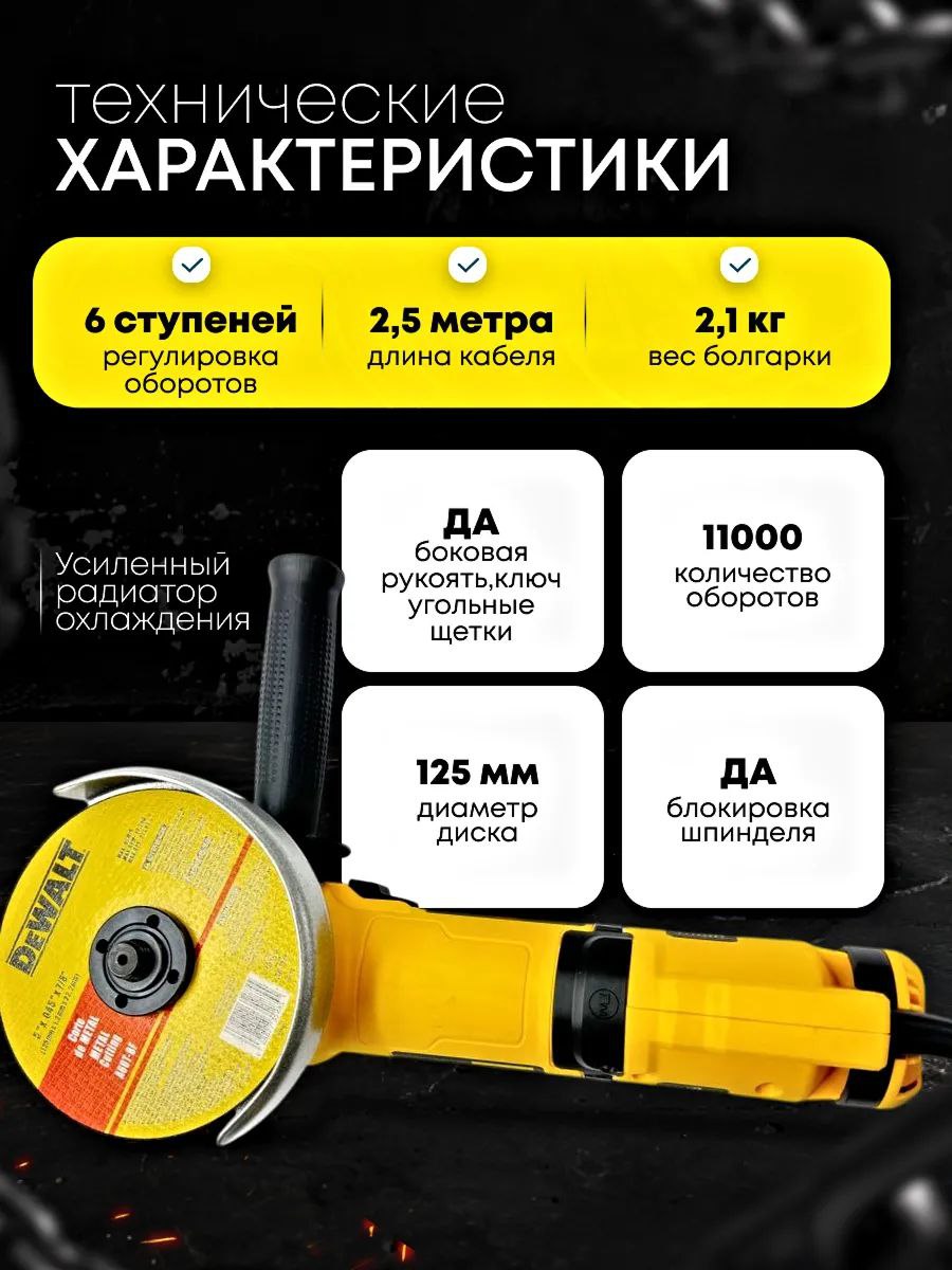 Преимуществом данной сетевой болгарки от других является компактный габарит и наличие регулировки оборотов с 6 режимом скорости для выполнения различных работ под нужным вам оборотом.